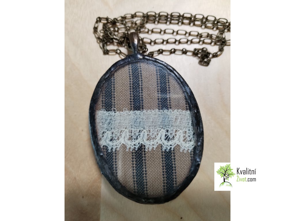 Medailon Bílá kočičkam na zadní straně starobylá ručně vyšívaná krajka. Velikost medailonu 38 x 55 mmm. Přiložen řetízek v délce 2x 28 cm.
