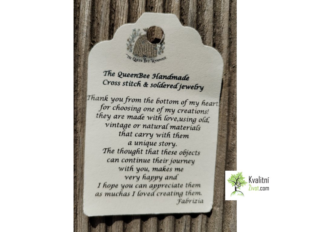 V Itálii mi učaroval malý krámek umbrijské umělkyně Fabrizie se šperky a krásnými věcičkami. Při druhé návštěvě téhož místa jsem se s ní seznámila a nakoupila jsem u ní pár krásných a originálních šperků s nádechem italského šarmu. Všechny šperky vyrábí sama ručně s láskou, používá vintage a přírodní materiály s příběhem, kterým vdechuje další život. Jak říká, tyto šperky pak pokračují svou další cestu s vámi, přeji si, aby vám přinášely radost, jako mě jejich láskyplná tvorba. Rozhodla jsem se Fabrizii nejenom podpořit vlastním nákupem, ale též rozšířit její umění k nám a našim ženám přinést možnost nosit tyto šperky italské elegance ve stylu moderních starožitností. A věřte mi šperky rozhodně budí pozornost a kdykoli si vezmu svůj náhrdelník, pokaždé mě někdo kvůli němu osloví .-))