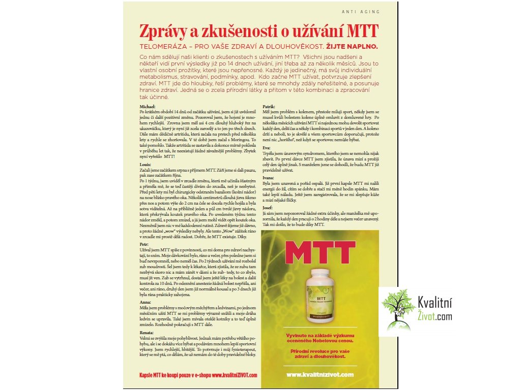 Za objev TELOMERÁZY byla v roce 2009 udělena NOBELOVA CENA. MTT je přírodní produkt s aktivátorem lidské telomerázy. Produkt je určen pro omlazení a dlouhověkost. Doporučujeme užívat od 40 let výše.
