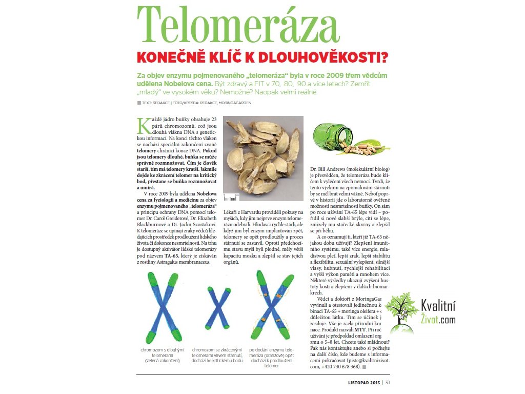 K telomeráze se upínají zraky vědců hledajících prostředek prodloužení lidského života či dokonce nesmrtelnosti. Aktivátor lidské telomerázy pod názvem TA-65 a je získáván z rostliny Astragalus membranaceus.